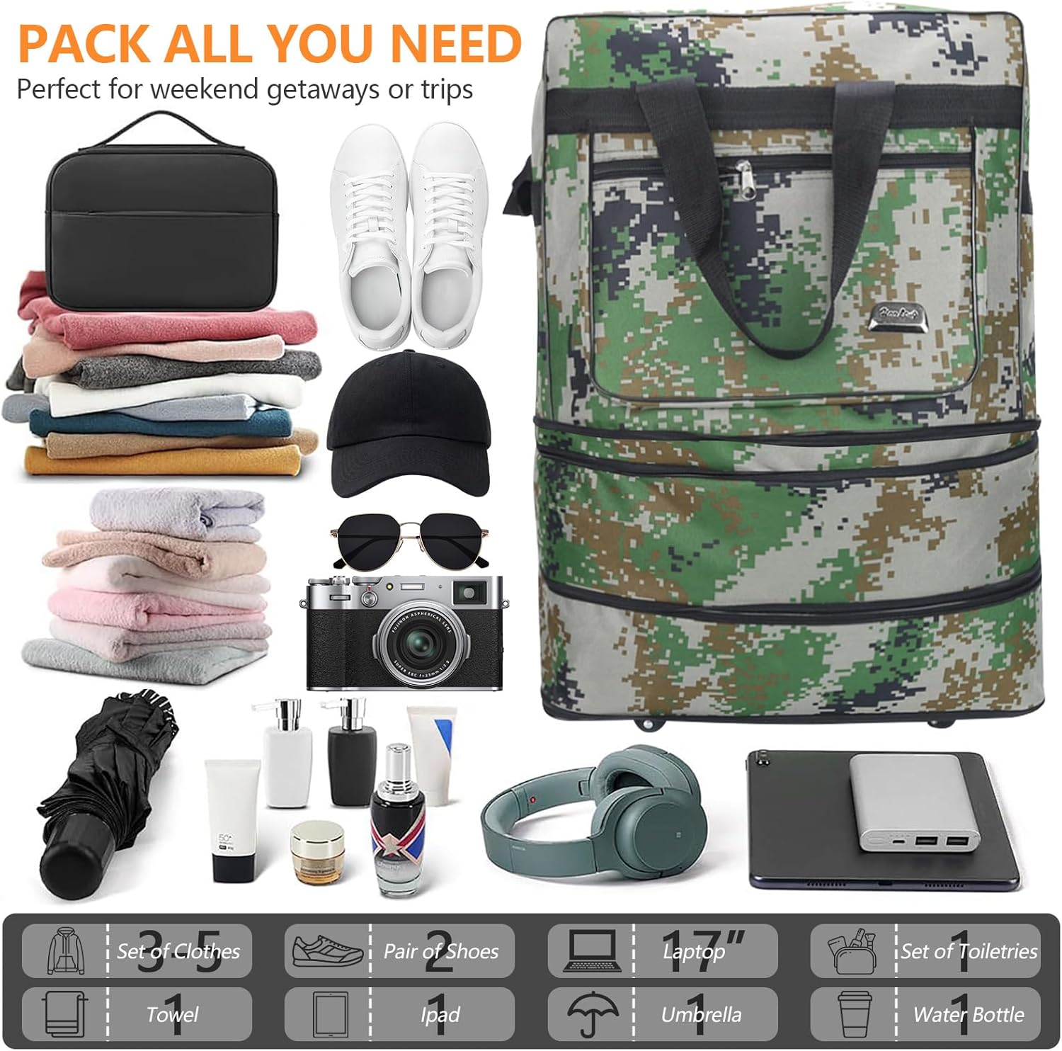 • Perfect for All Your Travel Needs: Designed for efficiency and comfort, this rolling duffel bag is the ultimate travel companion. Its perfect size accommodates essential items for 3-5 day trips, while its expandable design is perfect for sporting events, short getaways, daily shopping, outdoor adventures, and more. It's the everyday bag that travels with you everywhere.