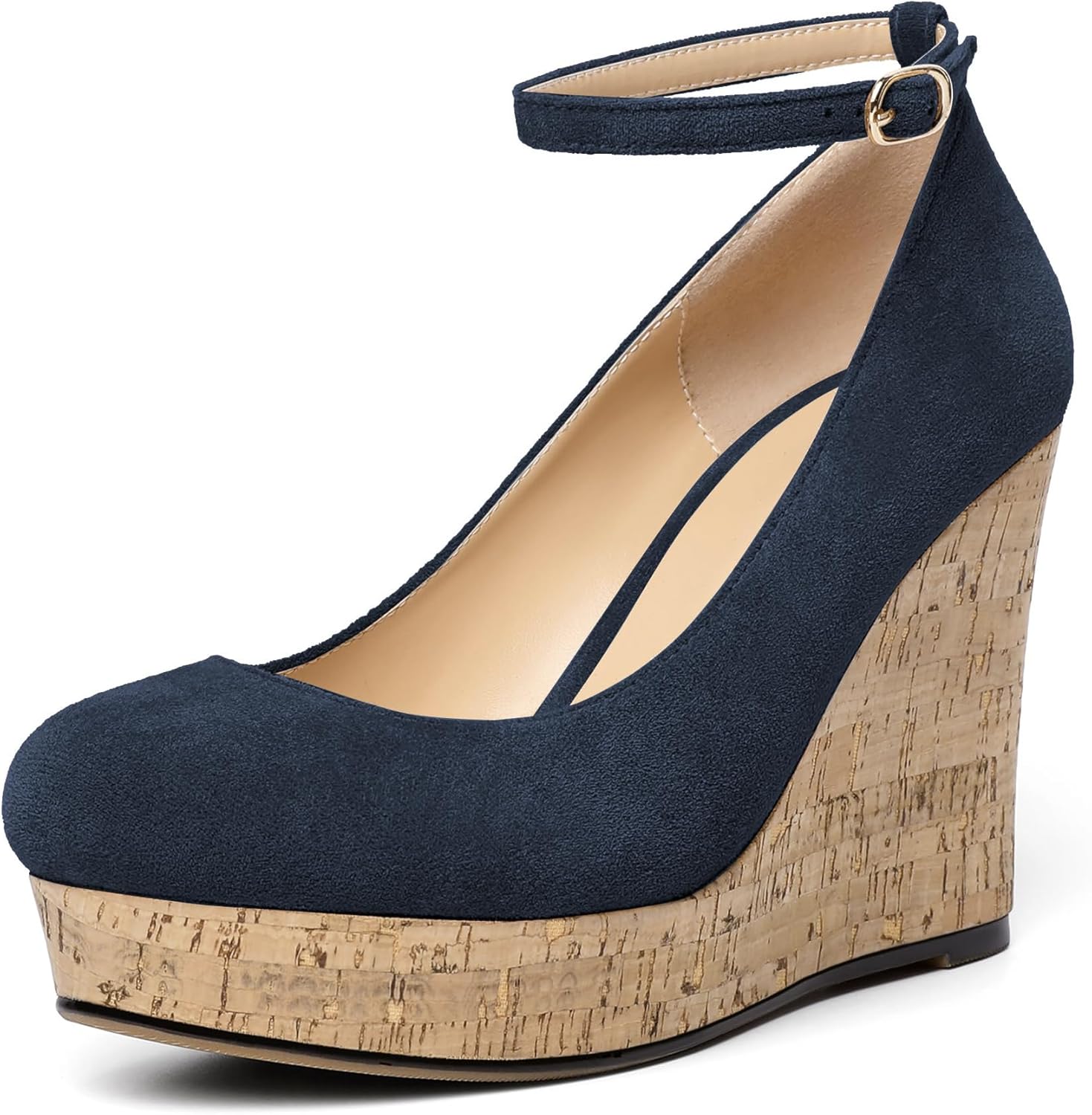 ★AUMOTED Women's Wedges Wooden Heels Pumps Closed Round Toe Buckle Ankle Strap Suede Heels Shoes for Ladies Casual Dress Summer 3.93 Inch High Heeled