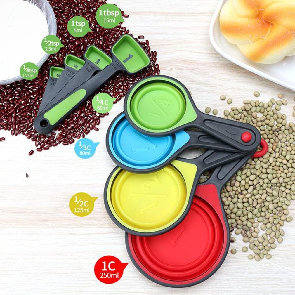 Package includes 4 pcs collapsible measuring cups ((250ml, 125ml, 80ml, 60ml) 4 measuring spoons (15ml, 5ml, 2.5m 1.25m) 1 silicone funnel (large) 1 silicone funnel (medium) 1 silicone spatula(8.26inch×1.65inch) 1 silicone whisk(8.26inch×2.16inch) 1 silicone oil brush(8.26inch×1.37inch) Features The toughness and elasticity of silicone products are very good, and they will not be deformed by external forces. They are non-toxic, tasteless and colorless, and are not harmful to the human body, and will not transmit any taste or odor to your food. Food grade silicone cooking kitchen utensils are easy to clean with a sponge, dish soap and water, or you can put them safely in the dishwasher Notice 1.Before first use, wash silicone utensils with warm soapy water 2.Avoid contact with scissors to prevent scratches or damage and remain durable 3.Do not use abrasive detergents or scourers. 4.Do not place in microwave ovens.