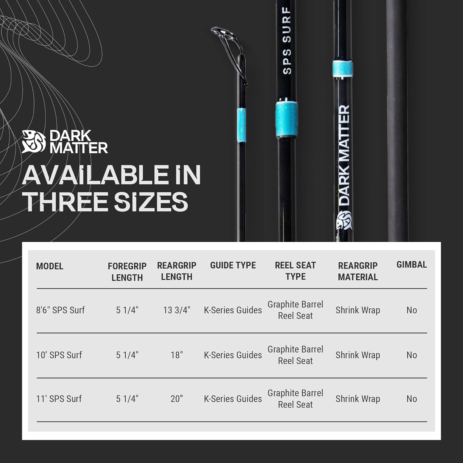 A lot went into the Dark Matter SPS Surf Spinning Rods. Over the years we have made a diverse line of surf rods that anglers love but we had never made a series that was under $250. If we were going to make something that was accessable to a wider range of anglers it had to meet the Dark Matter standards. It must deliver high performance, great style and value to the angler. That is something that just doesn't exist in a surf rod for less than $200 - until now! We started with the rod actions and tuned them until they were perfect. Next we worked on the look. Dark Matter is known for our beautiful designs so we painted the blank a glossy black and used a beautiful shade of blue with white accents for the wraps. We paid close attention to the transitions on this series to make sure it was streamlined and comfortable. There is nothing bulky on these rods. The fore and rear grips are shrinktube for durability. At the base on the foregrip is small amount of EVA for added comfort. We outfitted these rods with great components and are confident that when you have this in your hand you will instantly see the value.