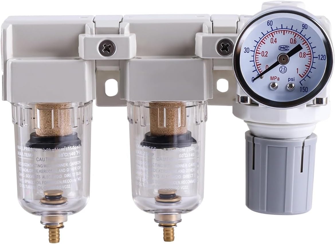FiltersFeature:1/4" NPT Air Filters/Regulator ComboDouble Brass Filter Elemen,:Excellent Filtering Performance, Much Longer Life and Reuse FeasibilityMax Supply Pressure:145 psi; Operating Pressure: 0-125 psiTemperature Range: 41-140 (5-60Flow Rate: 18 SCFM (500 L /Minute)@ 90 PSIPackage Includes:1x Semi-Auto Drain & Polycarbonate Bowl 0150 Gauge Bracket1x Nickelplated Iron Air 1x Nickelplated Iron Air Coupler2x 1/4" × 1/4" male brass equal hex nipples1x 1/4 "Mini Ball Valve2x PC-1/4-1/4NPT Male Connect Fitting1xTeflon tape.3/8" NPT Air Filter/Regulator ComboDouble Brass Filter Element:Excellent Filtering Performance, Much Longer Life and Reuse FeasibilityTemperature Range: 41-140 (5-60);Flow Rate: 70 SCFM (2000 L /Minute)@ 90 PSIMax Supply Pressure:145 psi; Operating Pressure: 0-125 psiPackage Includes:1x Semi-Auto Drain & Polycarbonate Bowl with Metal Guard 0150 Gauge Bracket1x Nickelplated Iron Air 1x Nickelplated Iron Air Coupler2x 38" × 3/8" male brass equal hex nipples1x 3/8 "Mini Ball Valve2x PC-3/8-3/8NPT Male Connect Fitting2x PC6-01PT threaded joints1x Teflon tape.1/2" NPT Air Filters/Regulator ComboDouble Brass Filter Element:Excellent Filtering Performance, Much Longer Life and Reuse Feasibilityemperature Range: 41-140 (5-60);Flow Rate: 105 SCFM (3000 L /Minute)@ 90 PSIMax Supply Pressure:145 psi; Operating Pressure: 0-125 psiPackage Includes1xSemi-Auto Drain & Polycarbonate Bowl with Metal Guard 0150 Gauge Bracket1x Nickelplated Iron Air 1x Nickelplated Iron Air Coupler2x 12" × 1/2" male brass equal hex nipples1x 1/2 "Mini Ball Valve2x PC-1/2-1/2NPT Male Connect Fitting2x PC6-01 threaded joints1x Teflon tape.==========