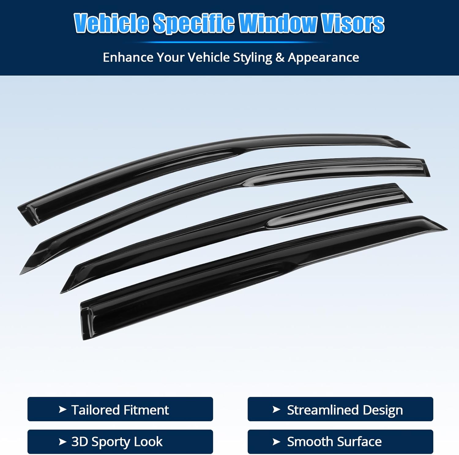 • ✔️ [SIMPLE AND FUNCTIONAL] - The window rain guards help block dazzling glare and reduce wind noise while driving. They also allow windows to be partially open to improve ventilation, remove odor, lower interior temperature, prevent window fogging and annoying rain, snow and debris from getting into the vehicle, making your ride safe and pleasant.