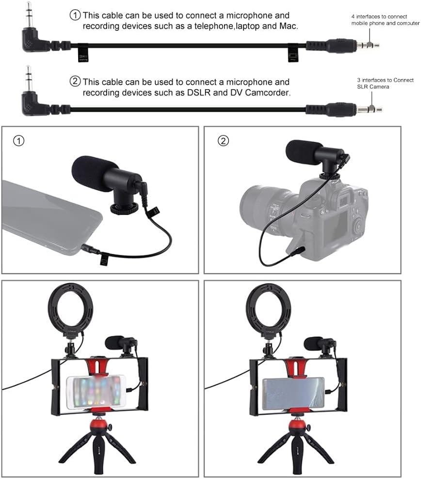 LED SpecificationsNumber of beads: 40pcsLamp bead model: 2835Lamp brightness: 24-26lmWhite light color temperature: 6500KWarm white color temperature: 3200KPower: 4-8WVoltage: 5VIndicates: Ra>82Dimming range: 1%-Shell material: aluminumDimensions: outer diameter 120mm. inner diameter 86mmPower supply: port power supplyMicrophone:The microphone can be fixed on the DV with microphone hole and path. The MS stereo system enables a natural sound pick-up. Delivering a stereo sound image with superb clarity<;0.68KohmFit any device that have 3.5mm MIC socket and hot shoe, suitable for 3.5mm jack phonesMicrophone type: electret condenser microphoneMicrophone specification: 14*6.5mmDirectivity: Single pointFrequency response: 20-20000HzSensitivity: -42dB +/- 3dB (0dB = 1V / Pa).Signal to noise ratio: >65DBSPLTest voltage: 1.5VThe function of heat dissipation: Metal shell, even if it is used for a long time,there is no need to worry that the lamp will be hot.Extensive application: It is widely applied to outdoor photo light, filling light indoors, portrait, fashion, advertisement photography, shooting video etc.Package ListVlogging Rig x 1Microphone x 1Tripod Mount x 1Cold Shoe Tripod x 1 LED Light x 1 Cable Wire Control x 13.5mm Audio Adapter Cable x 2Note:1. Due to the problems of lighting effects and shooting angles, there will be certain tolerances in the product, please understand.2. Due to manual measurement, the product has some size tolerance.