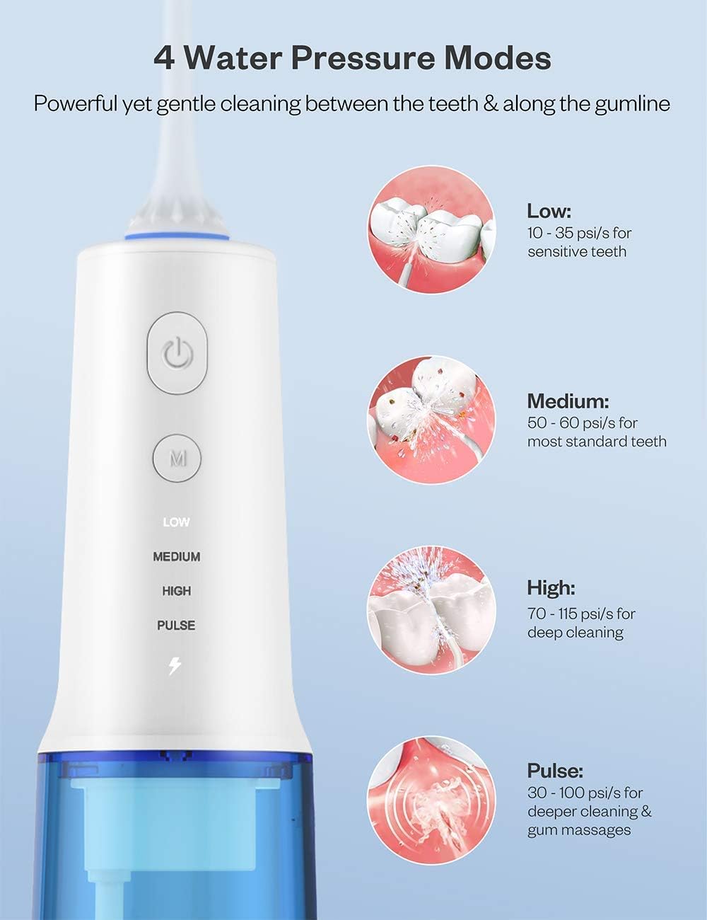 Easy-to-use water flosser with four modes:Standard pressure suitable for most people Gentle pressure for first time users or those with sensitive teeth Pulse for gum massage and to relieve oral bleeding, etc. Manual - choose the intensity of water flow according to your gums and dental conditions